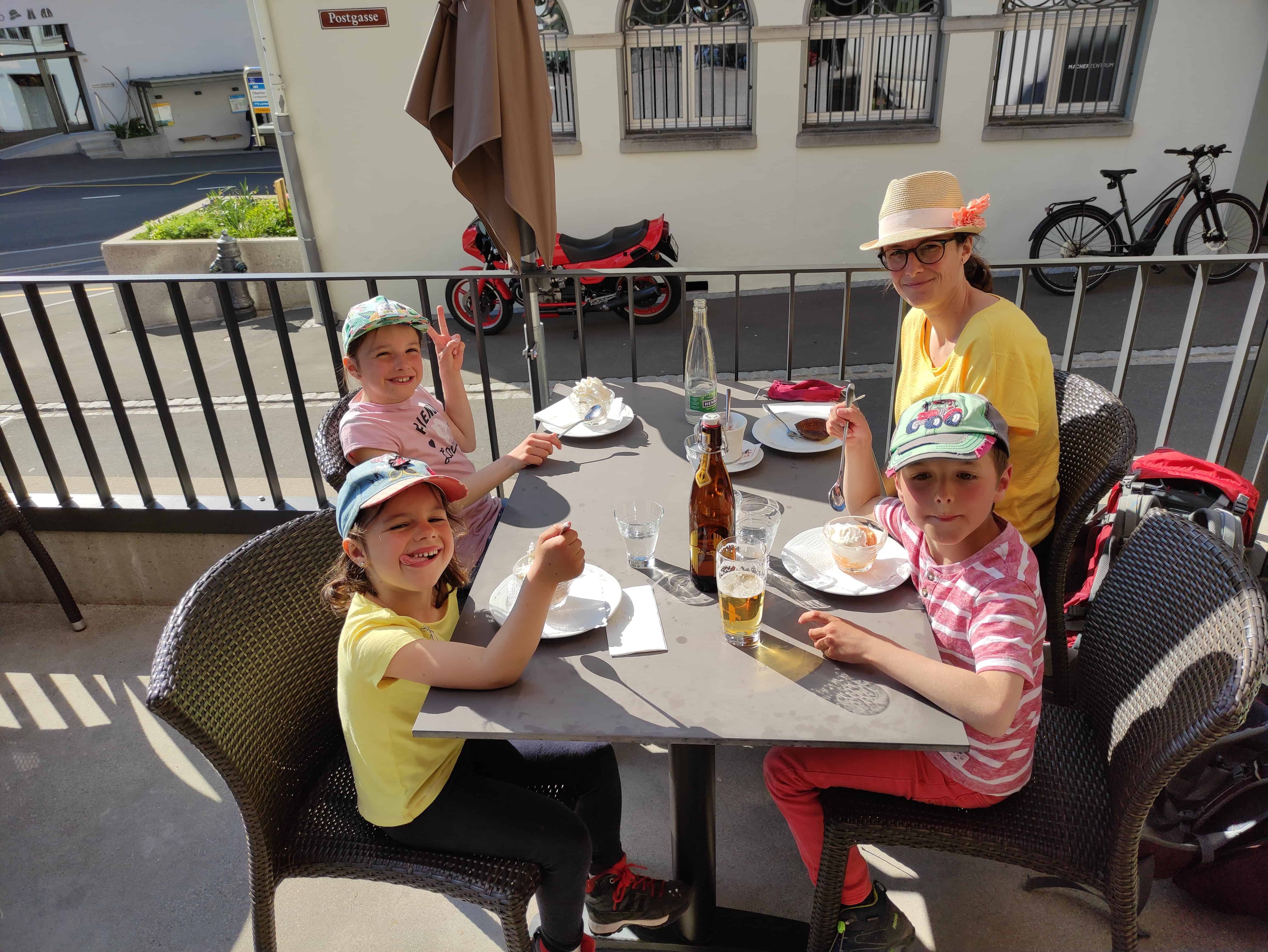 Picknick aus dem Rucksack, Getränke aus Selbstbedienungskühlschränken, Glacé auf der Terrasse der Cafe-Conditorei Huber