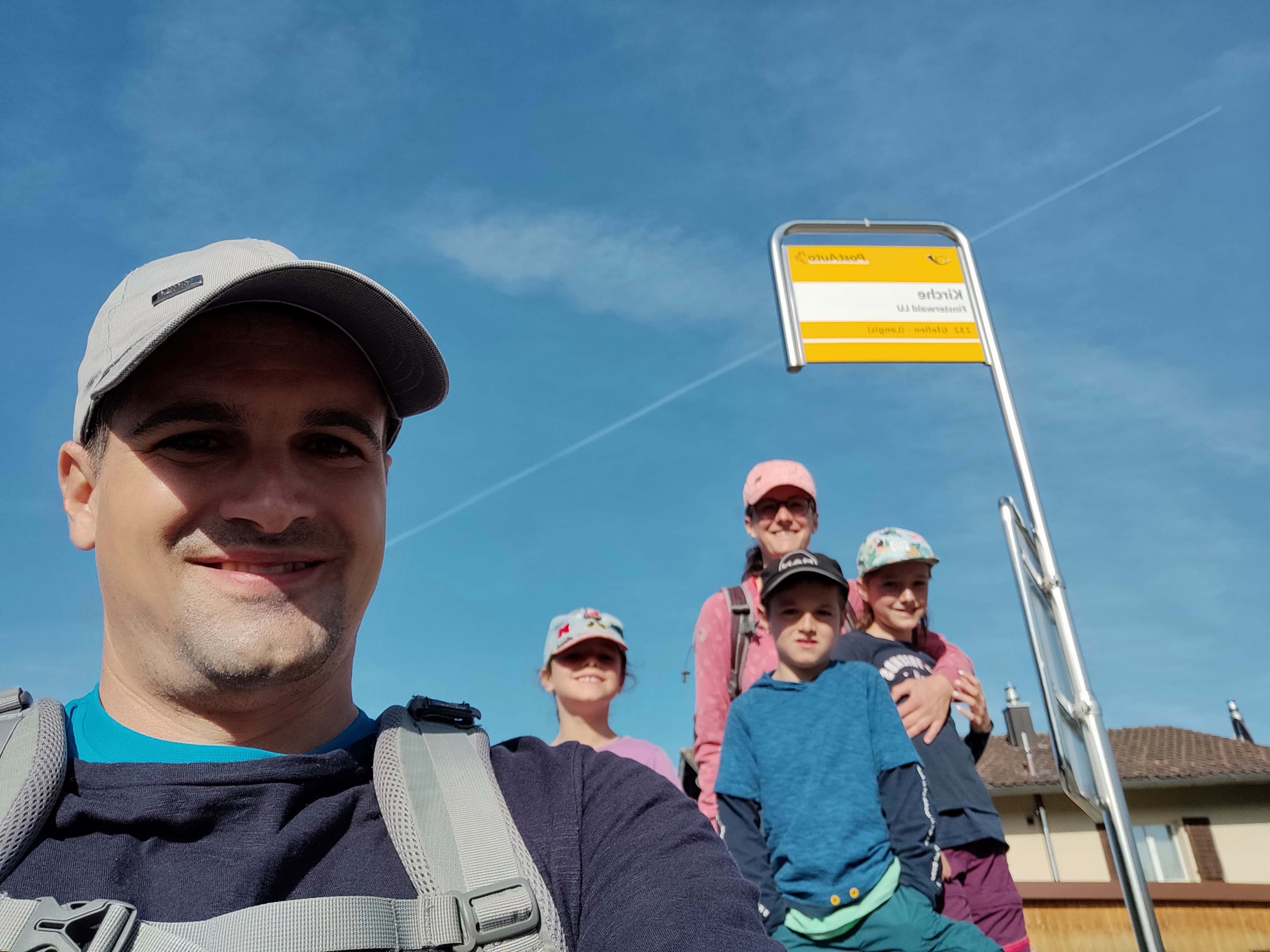 Finsterwald ab 08.40, Flühli an 15.00, 6:20 Gesamtdauer. Mit dem Auto vom Camping in Hasle (LU) zum Bahnhof Entlebuch. Von dort mit dem Postauto nach Finsterwald (Kirche). In Flühli sind wir mit dem Postauto nach Schüpfheim und von dort mit dem Zug nach Entlebuch gefahren. Mit dem Auto zurück zum Camping.