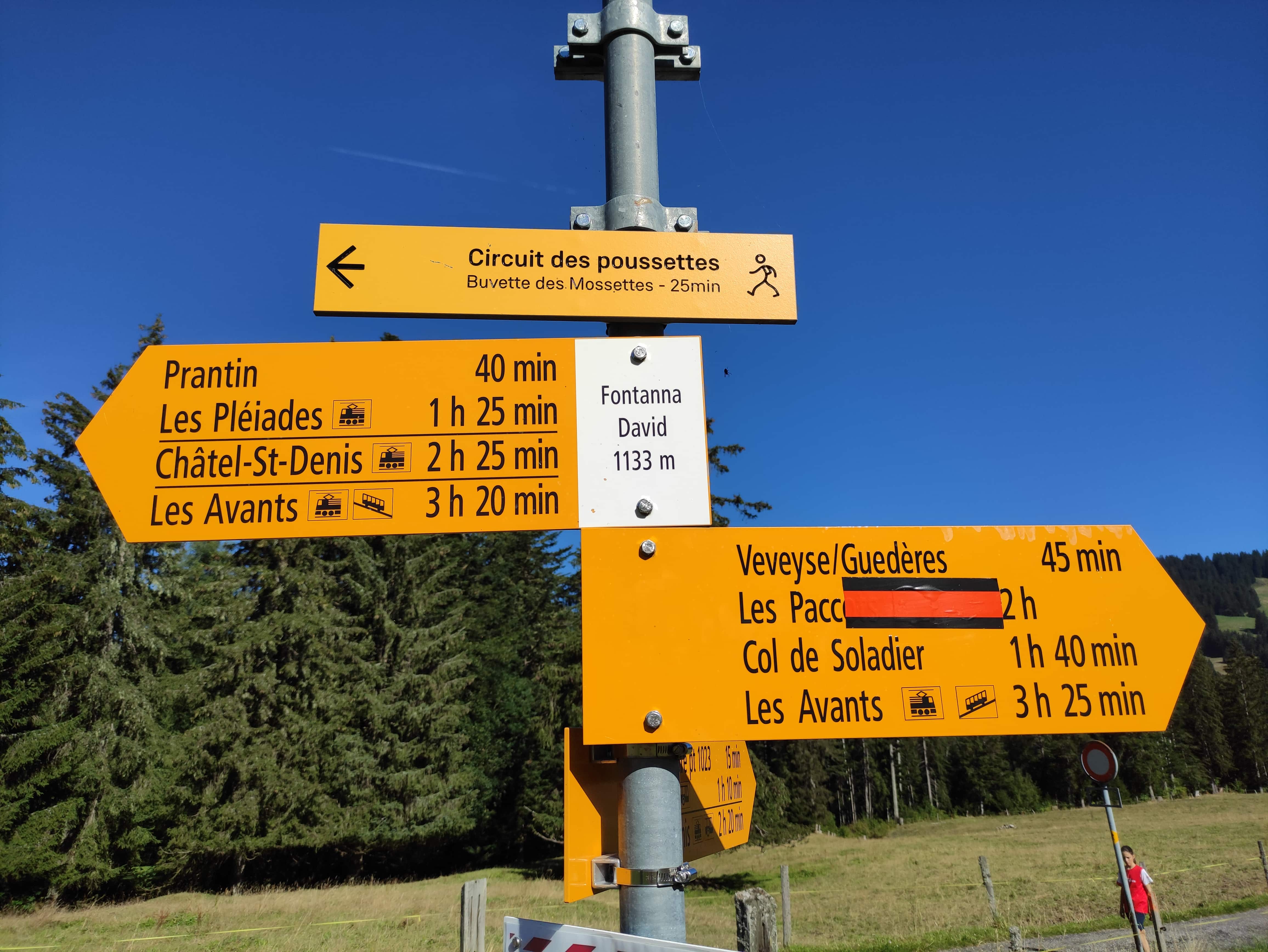 Les Paccots (Les Rosalys) – Les Joncs – Passerelle de Fégire (P. 1023) – Fontanna David – Les Mossettes – Les Pléiades – Les Chevalleyres – La Chiésaz – Château d’Hauteville – Vevey Marché