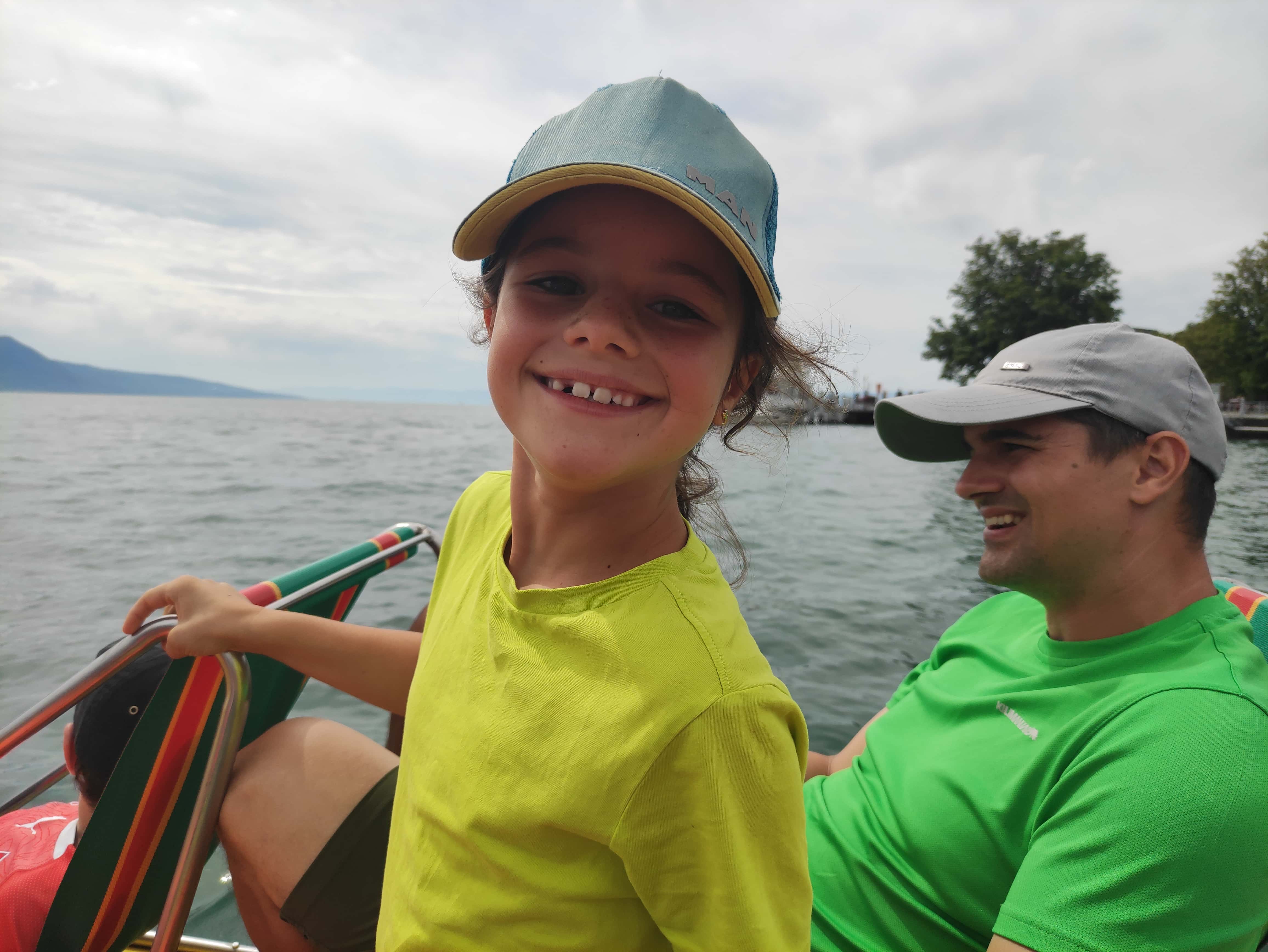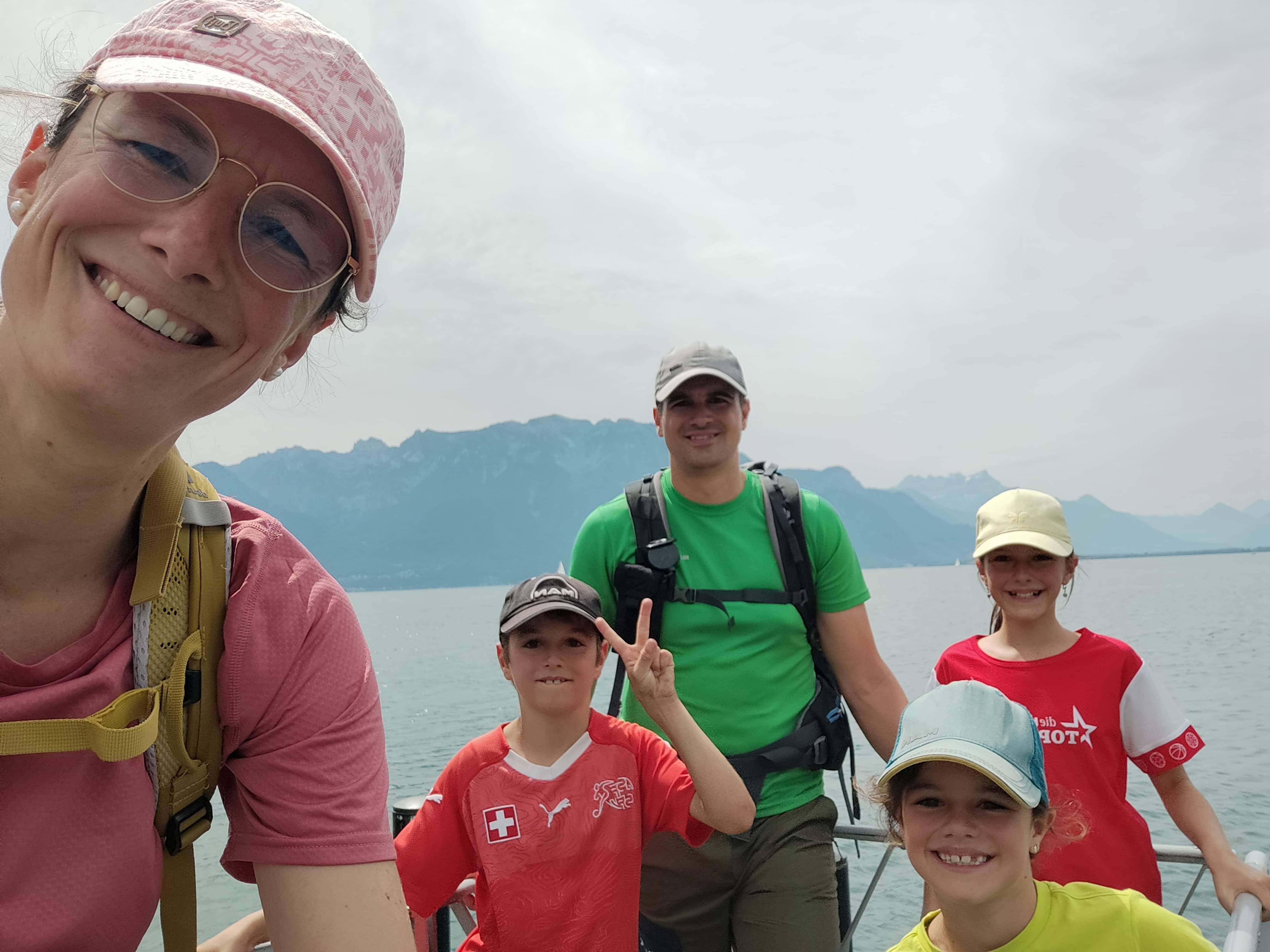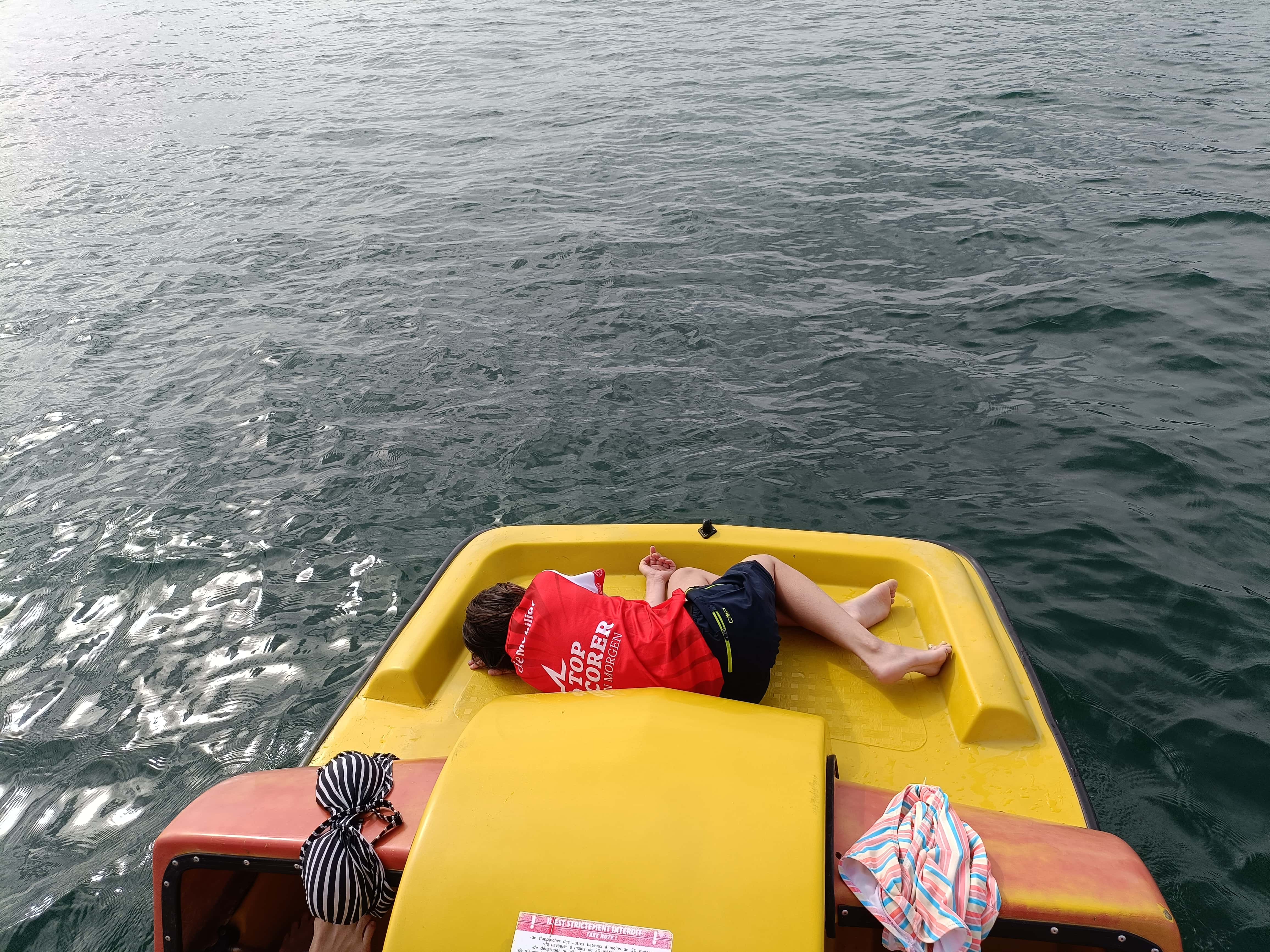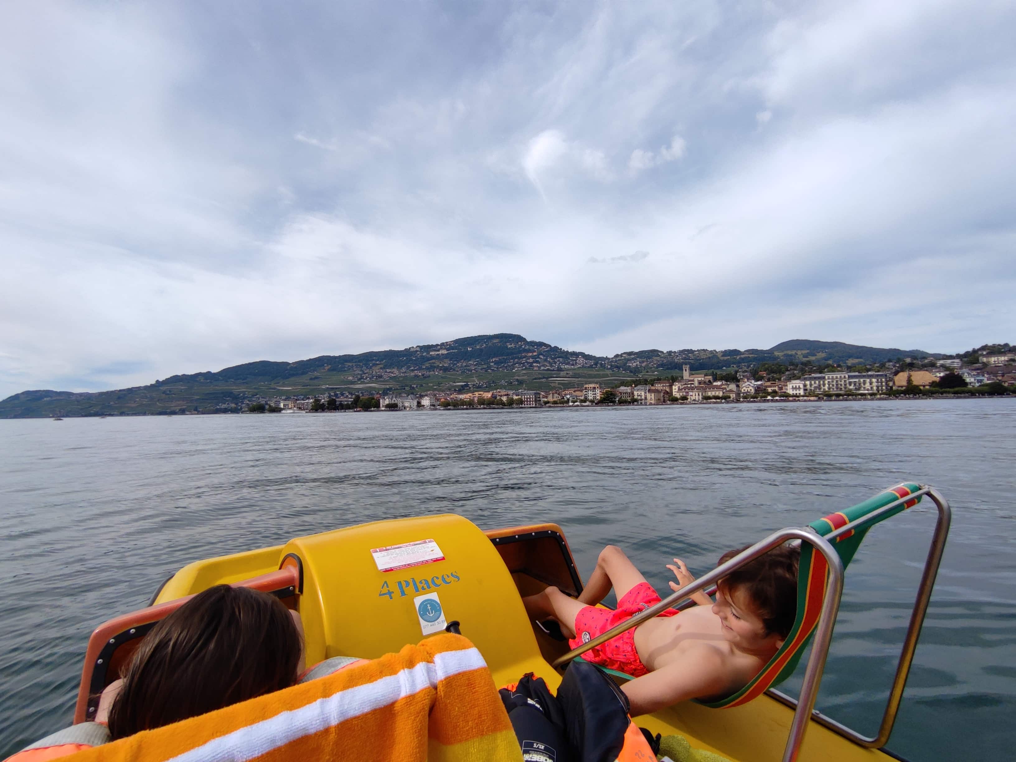 Was für ein Triumph! Wir haben es an den Genfersee geschafft. Mehr als 350 km liegen hinter uns (und stecken in unseren Beinen!). Stolz sind wir in Vevey einmarschiert. Wer hätte gedacht, dass wir das mit den Kindern schaffen würden? Und doch sind wir noch nicht am Ziel. Unser Ziel ist Genf, das wir in mindestens drei weiteren Etappen am französischen Ufer des Sees erreichen wollen. Als Belohnung für das bereits Geleistete haben wir ein Pedalo gemietet und uns ein Bad im Genfersee gegönnt.