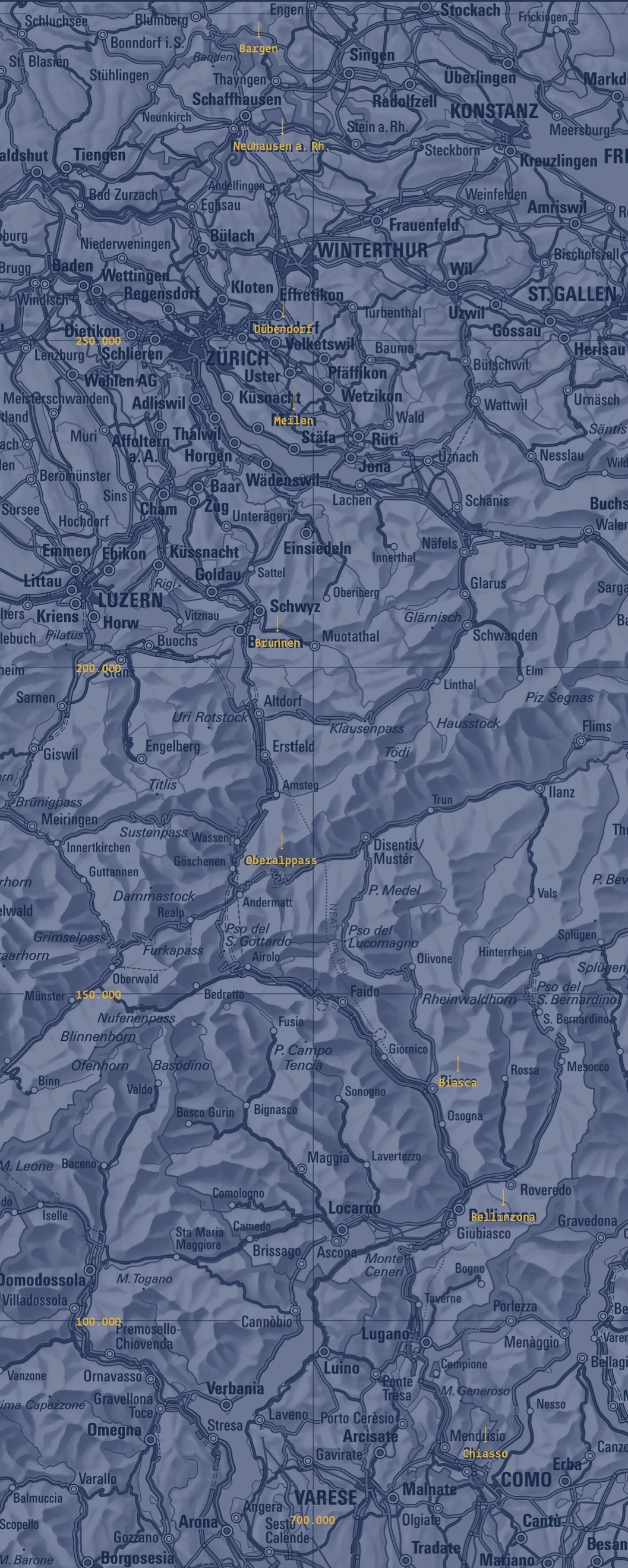 Auf den vorangehenden Seiten habe ich beschrieben, wie wir miteinander dem Alpenrand entlang von Rorschach bis Genf gewandert sind und dabei viel Freude und Schönes erlebt haben. Als wir so richtig Vergnügen an unserer Fussreise von Ost nach West gefunden hatten, ist uns auch sehr bald der Gedanke gekommen, eine ähnliche Durchquerung der Schweiz von Nord nach Süd zu unternehmen, d. h. von der nördlichsten Gemeinde im Kanton Schaffhausen (Bargen) bis zur südlichsten im Kanton Tessin (Chiasso) zu marschieren. Dabei war uns von Anfang an klar, dass es angesichts der Wegverhältnisse im Alpenraum mit einer Wanderung genau auf der Geraden seine Schwierigkeiten haben könnte. Ausserdem hatten wir in einem früheren Jahr schon ein recht schönes Stück auf der Alpensüdseite abgeschritten, nämlich die bekannte und überaus lohnende Strada alta am linken Talhang der Leventina von Airolo bis Biasca, die wir damals vom Standort Faido aus in zwei ziemlichen Gewaltetappen hinter uns gebracht hatten. Da wir schliesslich jedem Fanatismus abhold sind, fanden wir, es genüge in diesem Fall, die Nord-Süd-Richtung so gut als möglich einzuhalten und unsere Wanderung in Airolo und Biasca an die Tessiner Höhenstrasse anzuhängen. Eine solche flexible Lösung ist uns dann auch wieder ausgezeichnet gelungen. Ich hatte lediglich übersehen, dass die Koordinate 690, auf der wir zunächst von Norden nach Süden wanderten, ausgerechnet auch die Grenze zwischen zwei Kartenblättern 1:25’000 bildet, weshalb ich gezwungen war, immer zwei benachbarte Blätter zu beschaffen und mitzuführen, was unsern Kartenbestand nicht unwesentlich anwachsen liess.